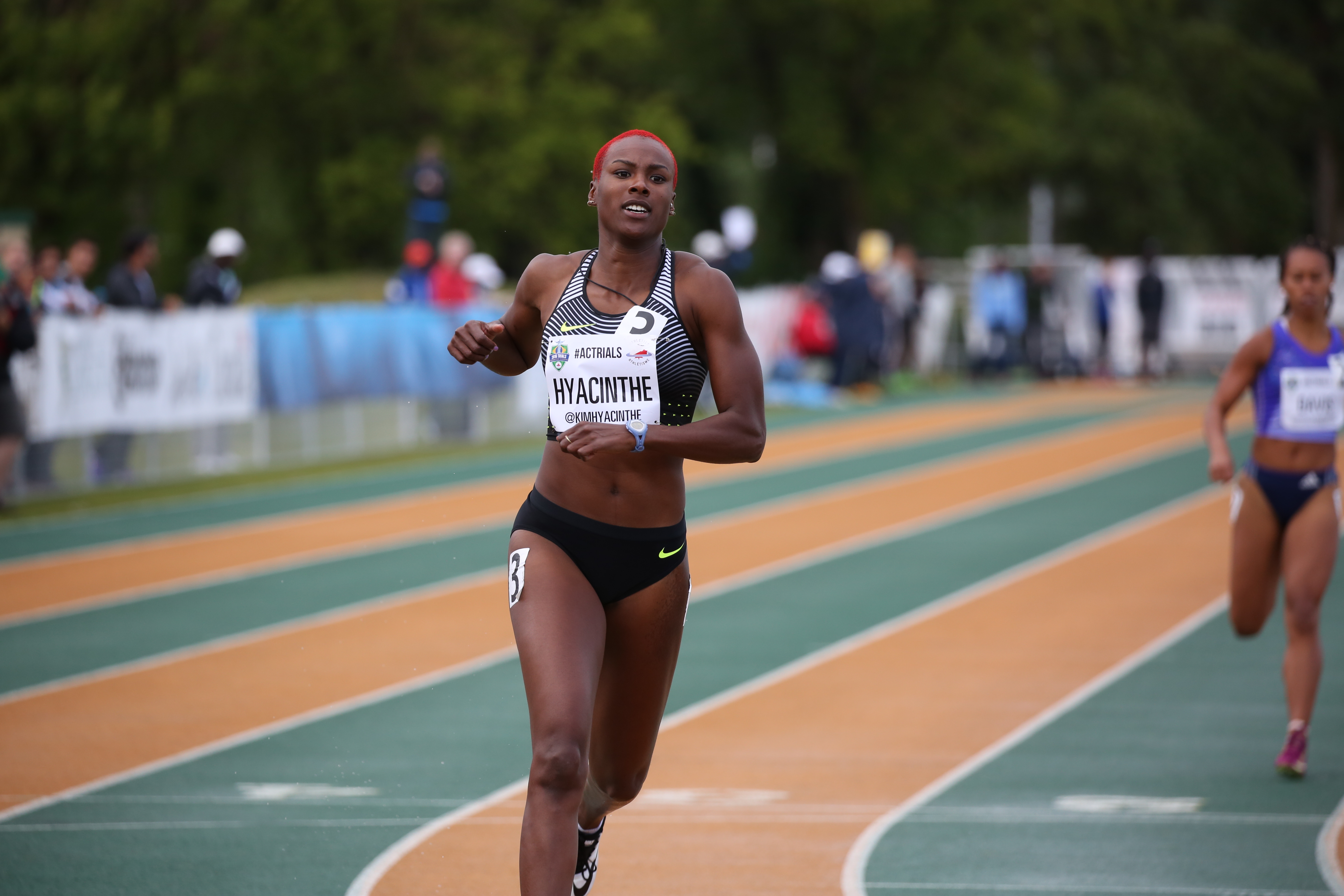 Kimberly Hyacinthe sprinting in the 200m at the Canadian Track and Field Championships and Selection Trials for the 2016 Summer Olympic and Paralympic Games, in Edmonton, Alta. Hyacinthe will also be running in the 4x100m relay (Steve Boudraeu/COC).