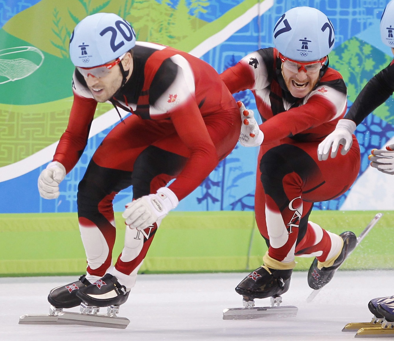 Canada’s Olivier Jean, right, pushes teammate Francois-Louis Tremblay to go on to win the gold medal in the men’s 5000 metre relay final in the short track speedskating competition Friday February 26, 2010 at the 2010 Vancouver Olympic Winter Games in Vancouver. THE CANADIAN PRESS/Paul Chiasson
