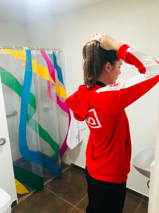 Les appartements peuvent accueillir jusqu’à cinq athlètes chacun. Les lits sont recouverts d’un édredon joyeusement coloré qui nous fait oublier le temps gris et frais de l’hiver à Lima. Les athlètes ont amplement de surface libre sur les murs pour pouvoir les personnaliser avec des drapeaux canadiens (évidemment), des photos de leurs famille et amis ou encore des lumières de Noël qui s’agencent au édredons, pourquoi pas?