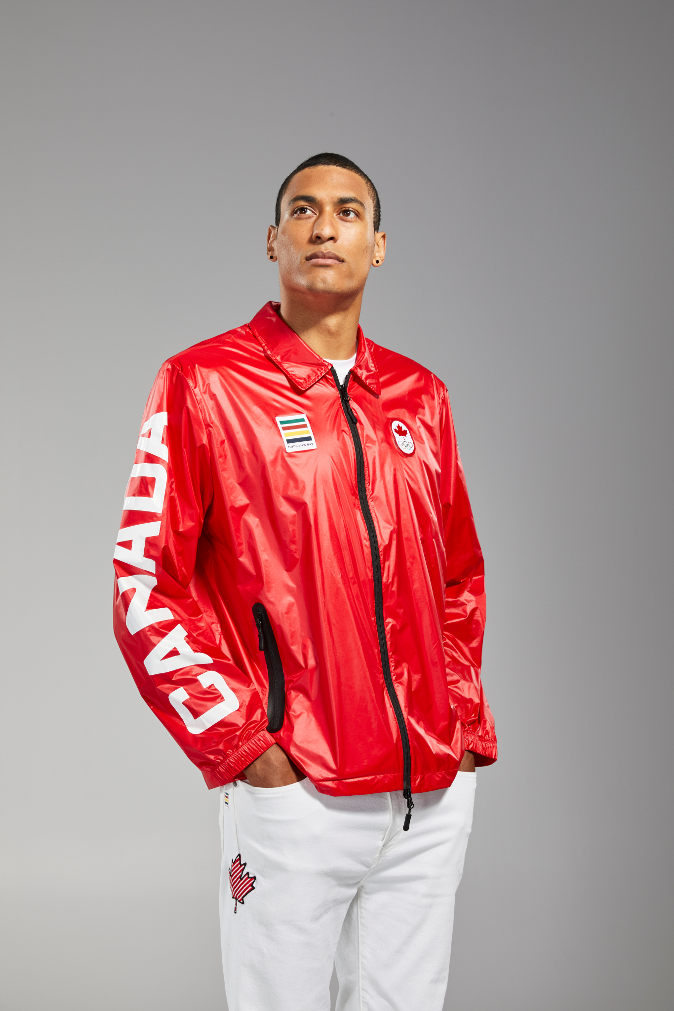 La beauté de l’ensemble se trouve dans les détails. La feuille d’érable est tracée par 13 bandes, représentant l’unité des 10 provinces et trois territoires du Canada. Le veston est fait d’un nylon léger et imperméable, assurant que les athlètes restent au frais et confortables, sous la pluie ou le soleil.