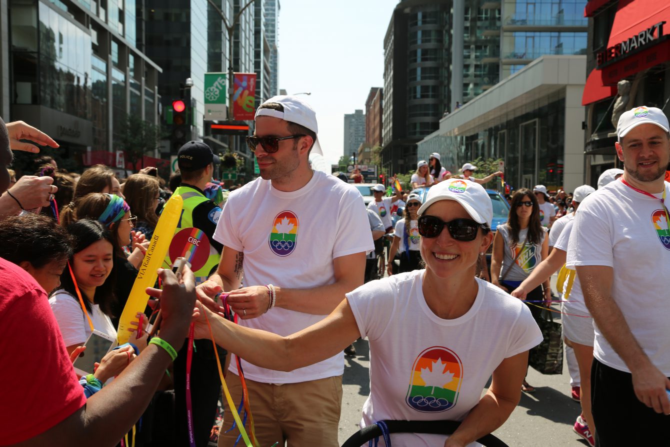 Les olympiens Étienne Lalonde-Turbide et Nadine Rolland lors du défilé de Fierté Montréal, le dimanche 20 août 2017. (Photo: COC/Steve Boudreau)
