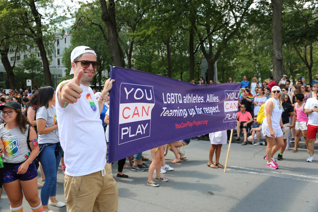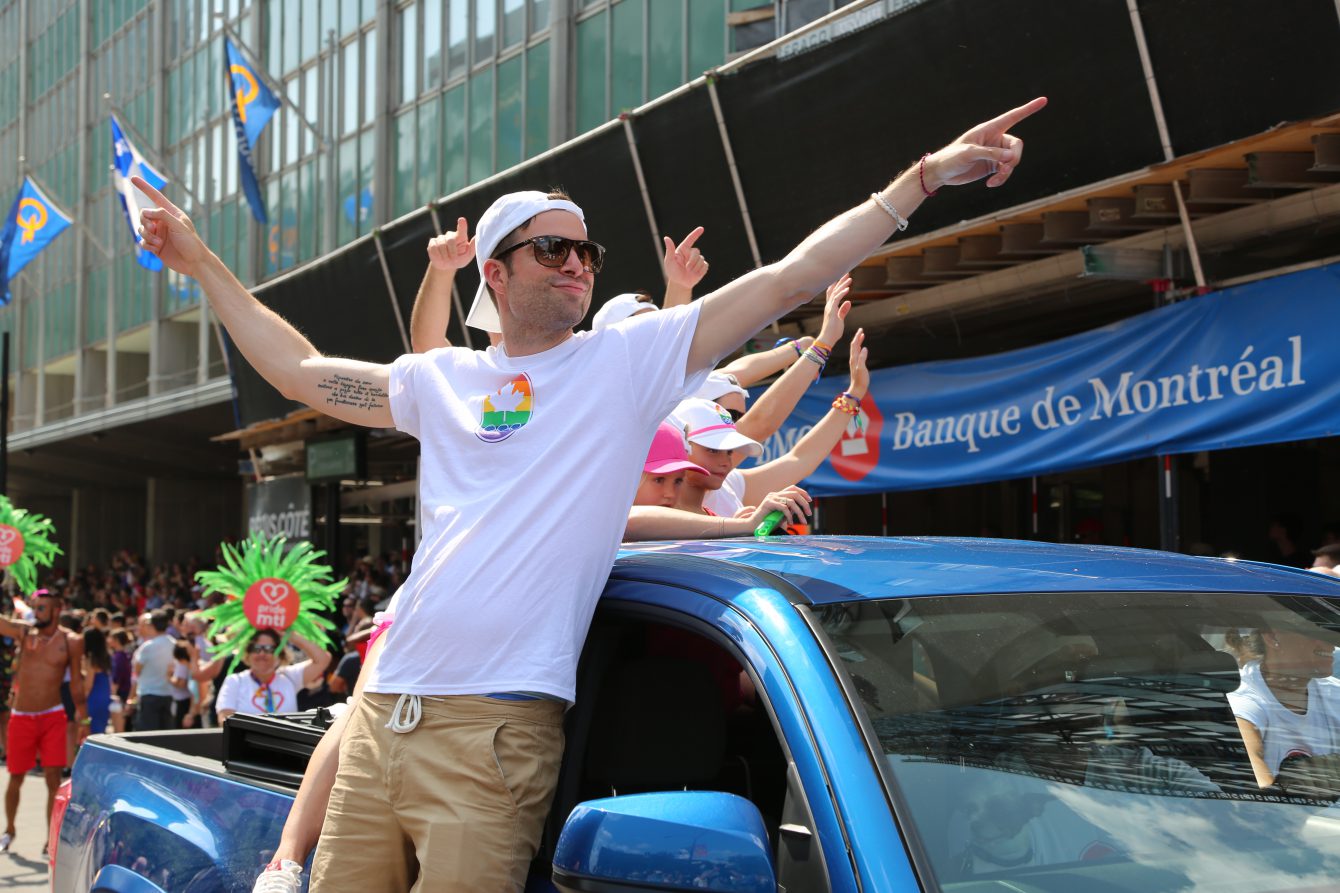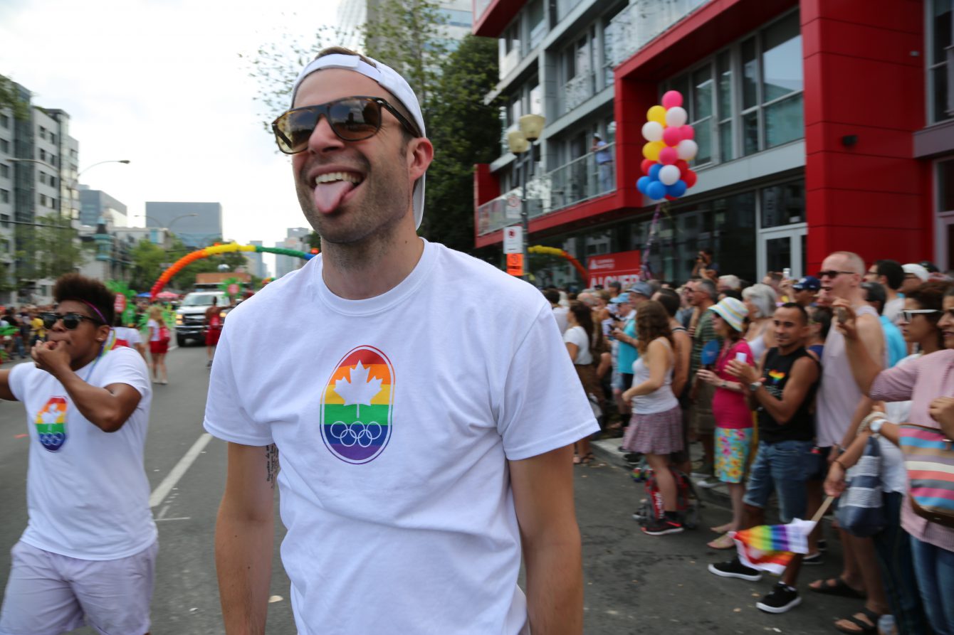 L’olympien Étienne Lalonde-Turbide lors du défilé de Fierté Montréal, le dimanche 20 août 2017. (Photo: COC/Steve Boudreau)