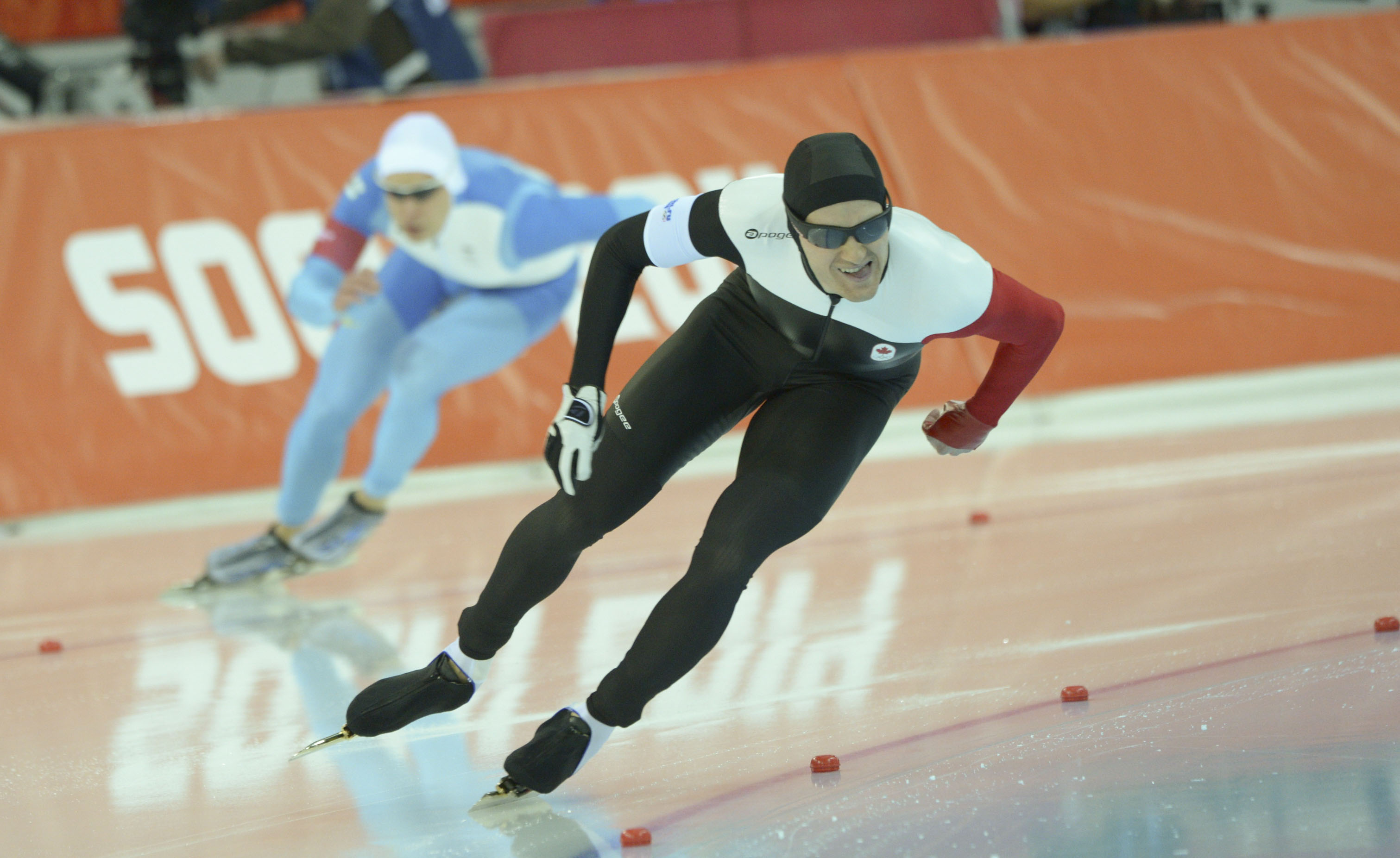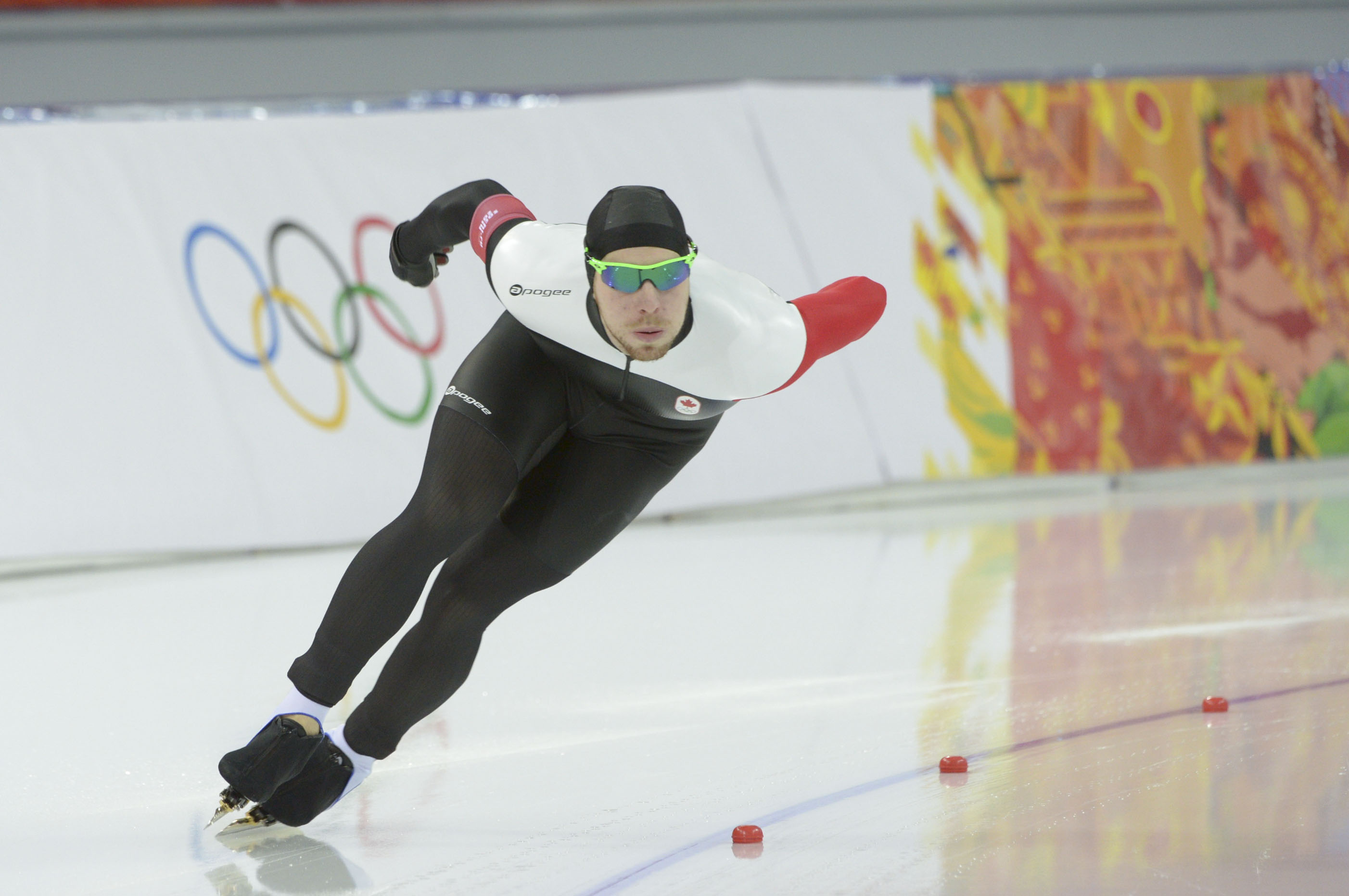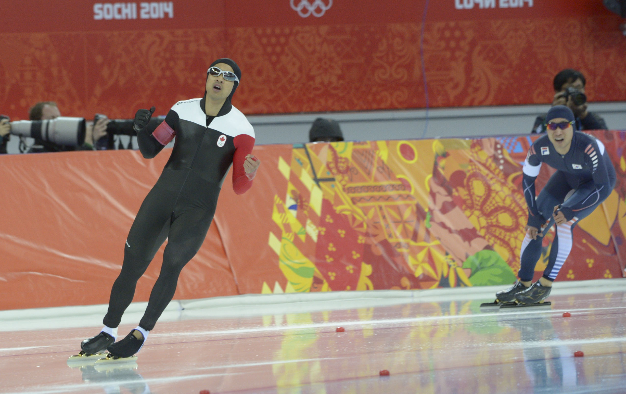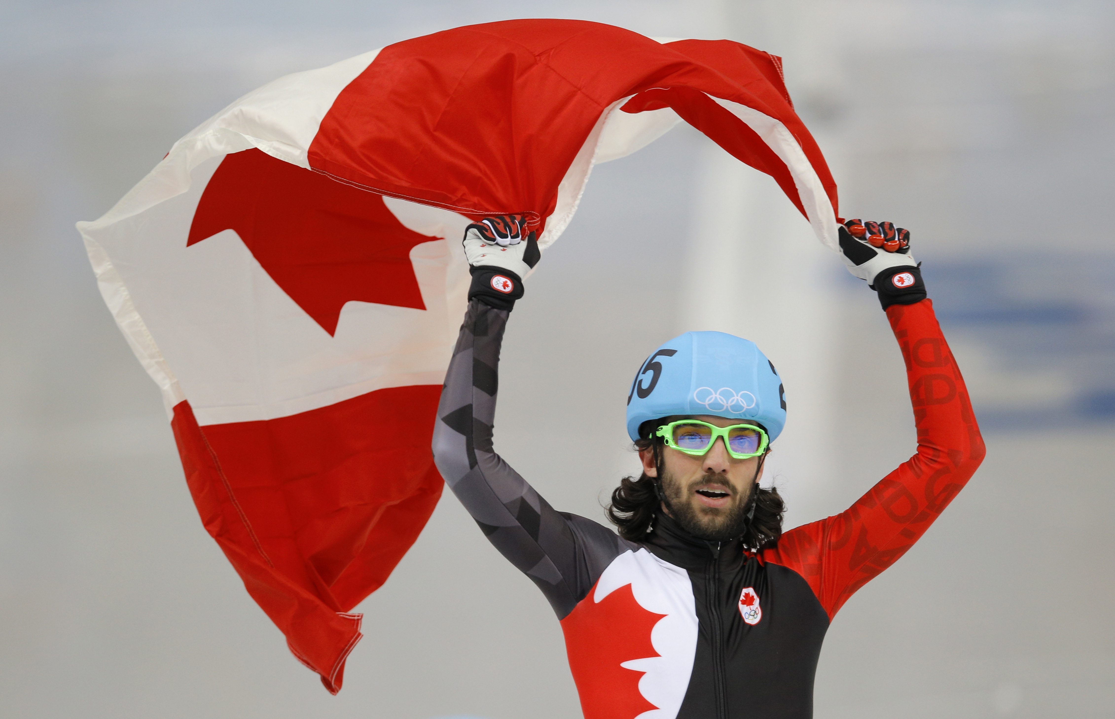 Charles Hamelin reçoit sa médaille d’or du 1500 m aux Jeux olympiques de Sotchi 2014, le 10 février 2014. COC/Mike Ridewood