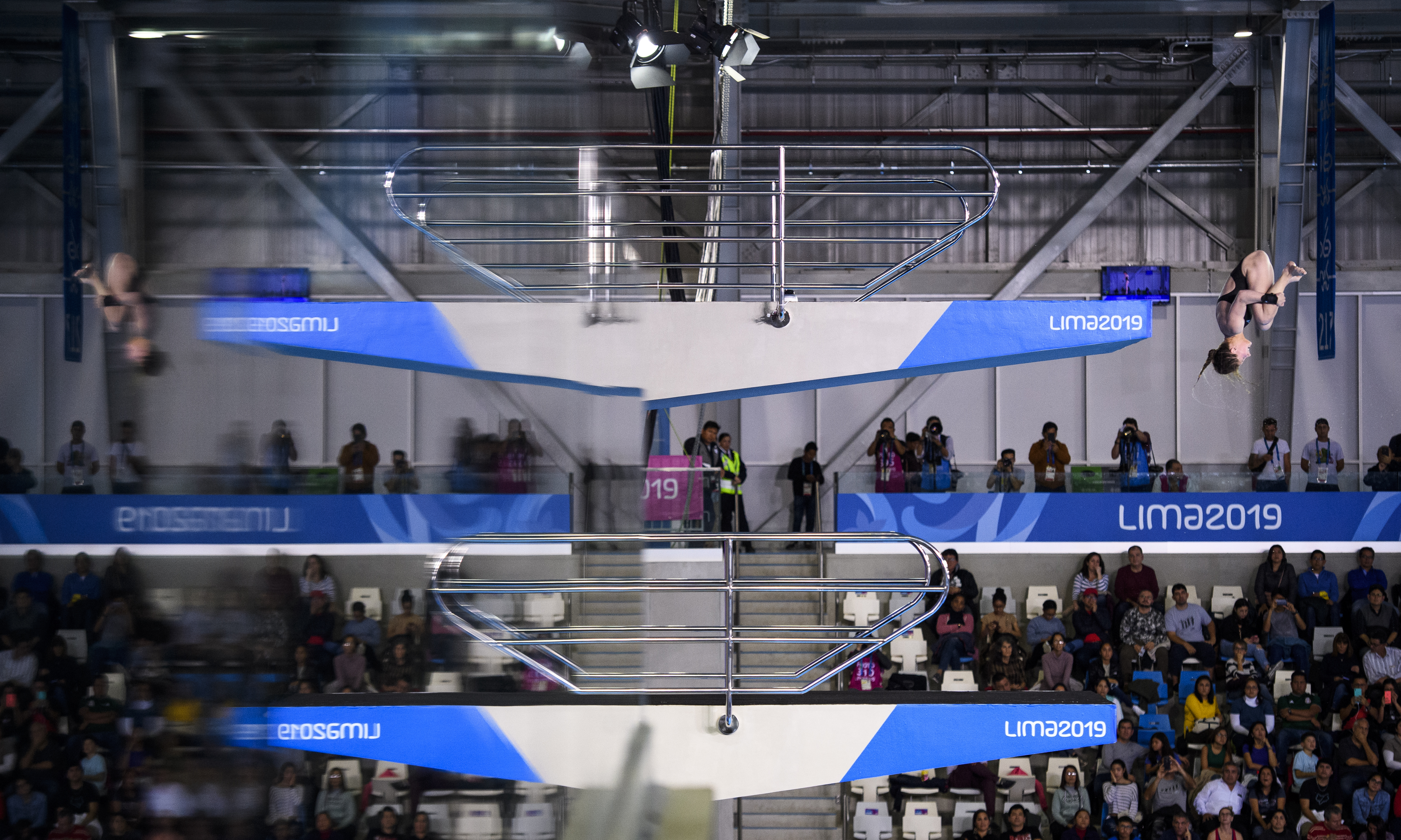 Meaghan Benfeito et Caeli McKay participent au 10 m synchro aux Jeux panaméricains de Lima, au Pérou, le 4 août 2019. Photo : Christopher Morris/COC