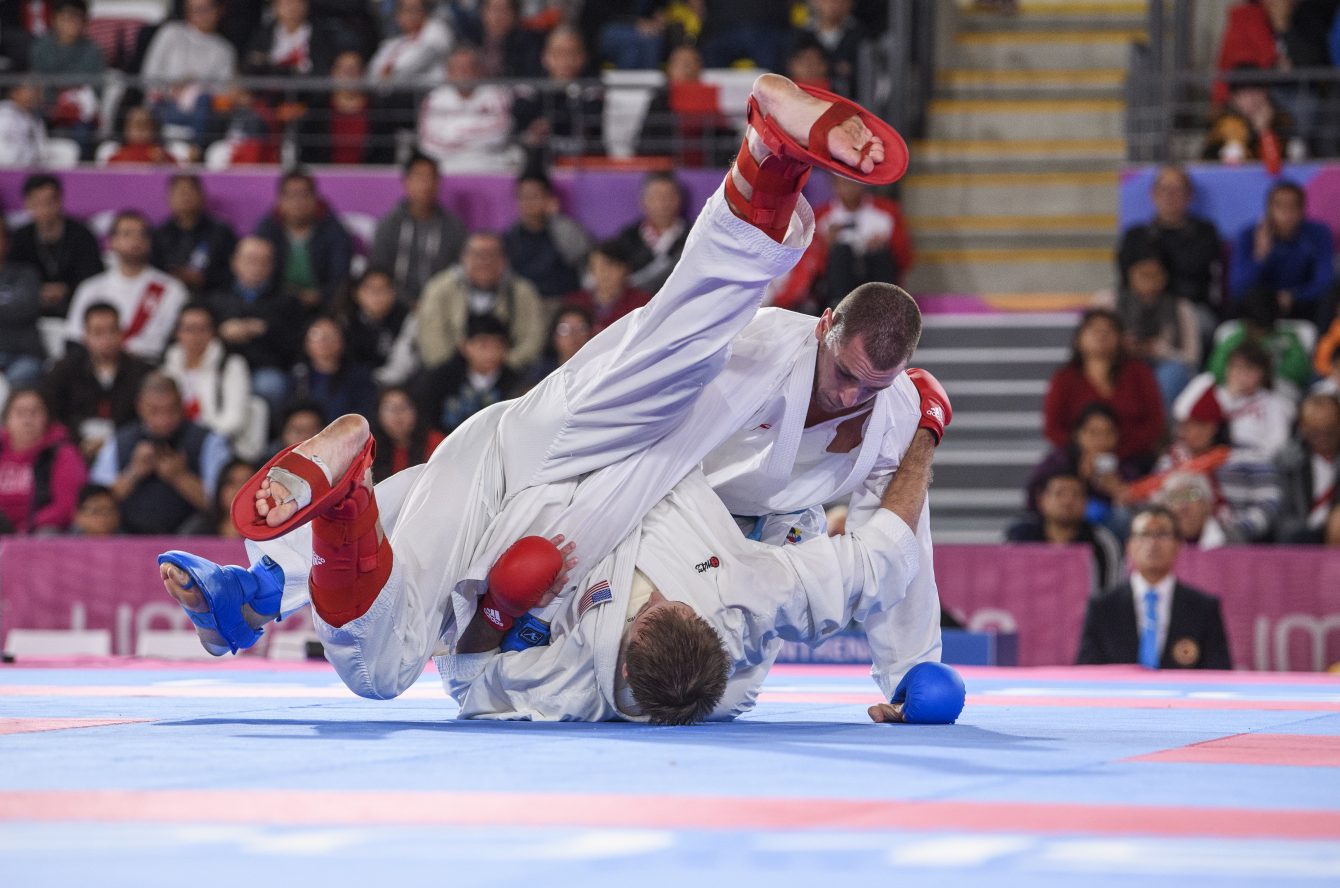 Daniel Gaysinsky du Canada, en bleu, affronte Brian Irr des États-Unis lors de la finale de karaté chez les hommes chez les 84 kg aux Jeux panaméricains de Lima 2019 le 10 août 2019. Photo de Vincent Ethier / COC