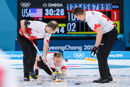 Marc Kennedy envoie une pierre durant la partie contre les États-Unis. (Photo COC Vincent Ethier)
