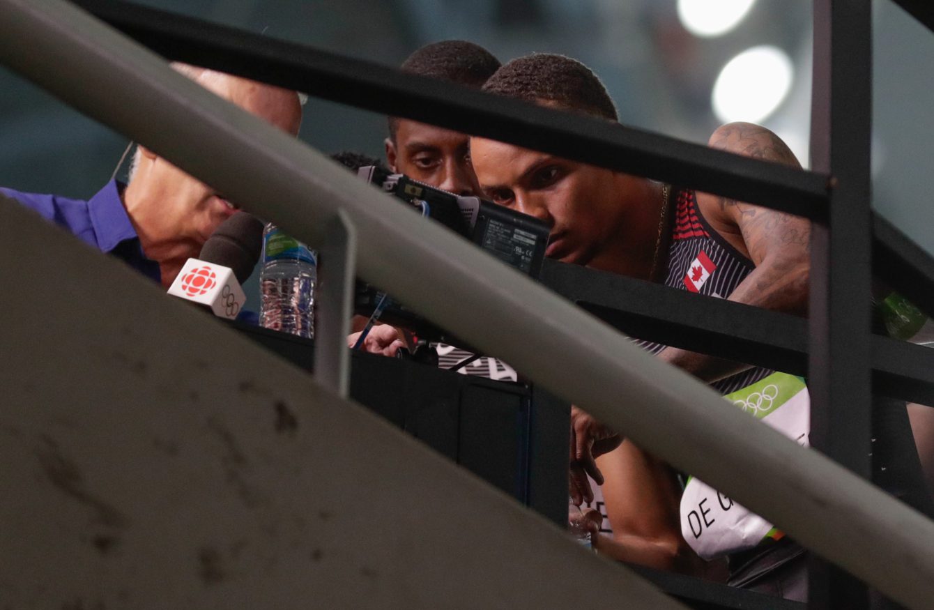 Andre De Grasse et suite à la finale olympique du relais 4×100 m Rio de Janeiro, le 19 août 2016. Le Canada y a gagné le bronze. THE CANADIAN PRESS/Frank Gunn