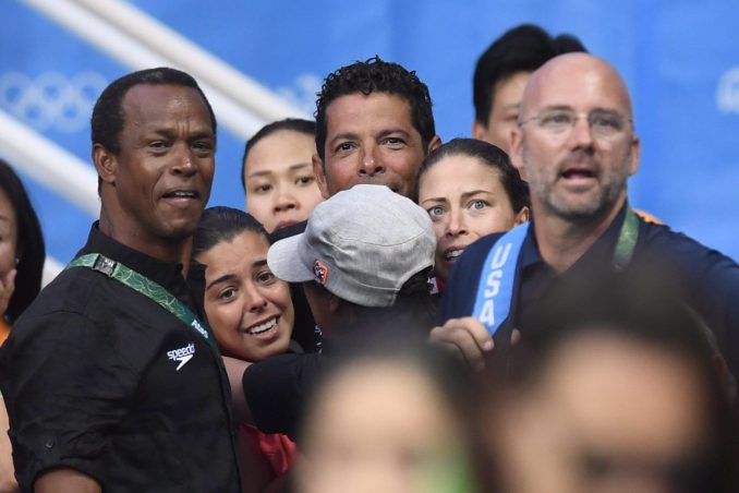 Meaghan Benfeito célèbre sa troisiéme place à la plateforme de 10 m avec son entraîneur aux Jeux olympiques de Rio, le 18 août 2016. Photo du COC/Jason Ransom