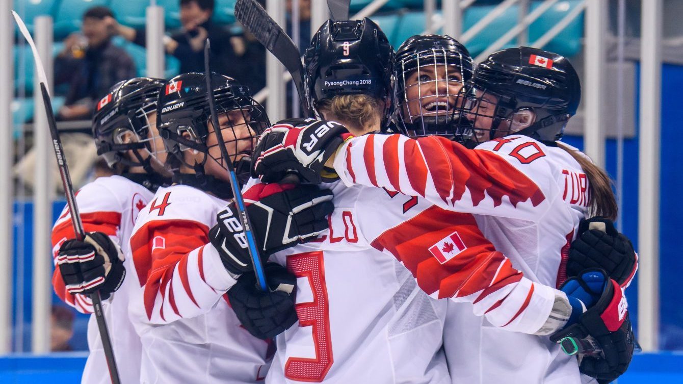 Canada forward Jennifer Wakefield (9) celebrates with teammate after scoring the 1st goal of the game during the Ice Hockey Women Play-offs Semifinals between Canada and Russia at the PyeongChang 2018 Winter Olympic Games at Gangneung Hockey Centre on February 19, 2018 in Pyeongchang-gun, South Korea (Photo by Vincent Ethier/COC)
