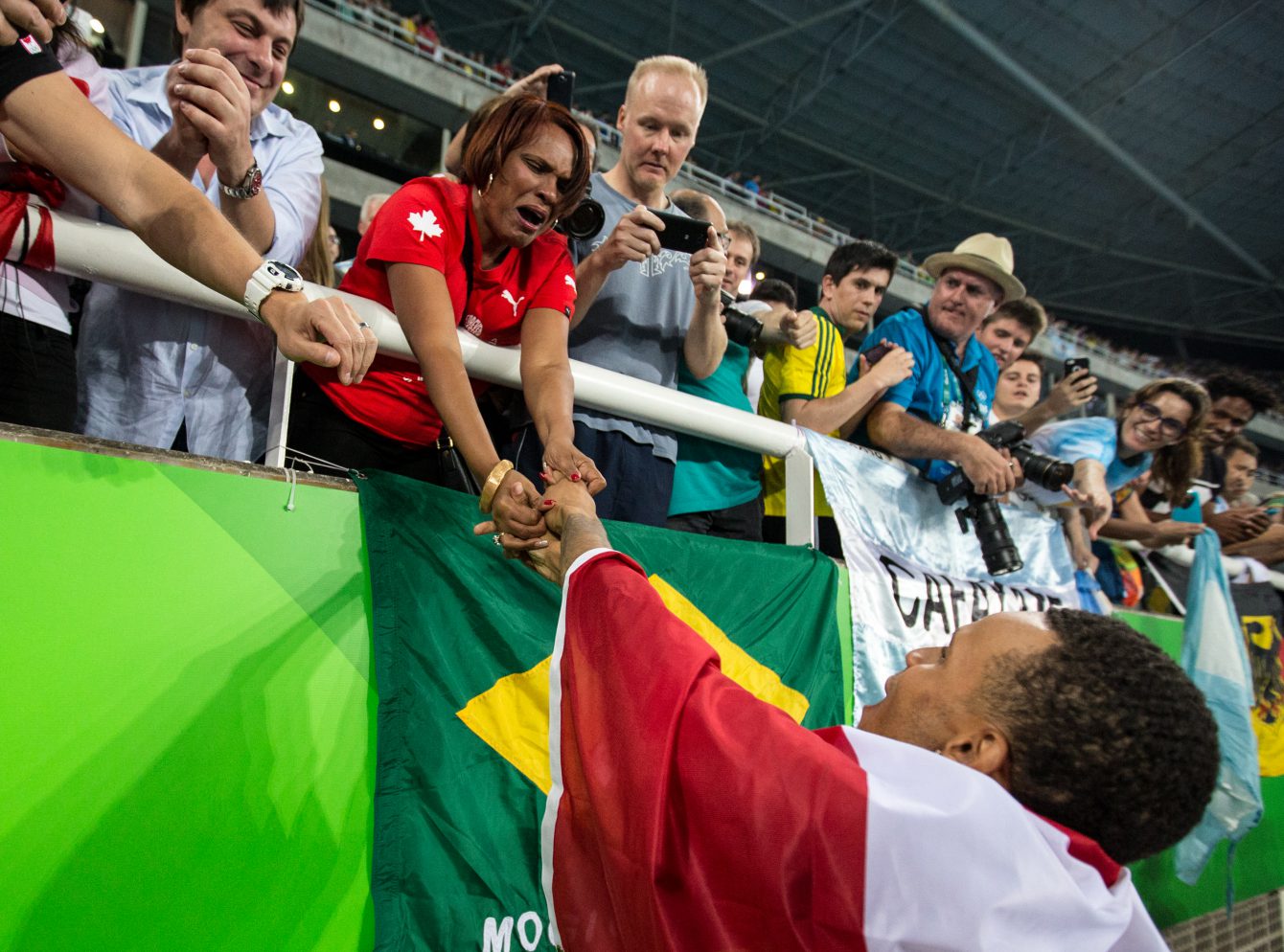 Canada’s Andre De Grasse celebrates bronze in the men’s 100-metre final during the athletics competition at the 2016 Olympic Summer Games in Rio de Janeiro, Brazil on Sunday, August 14, 2016. THE CANADIAN PRESS/Sean Kilpatrick
