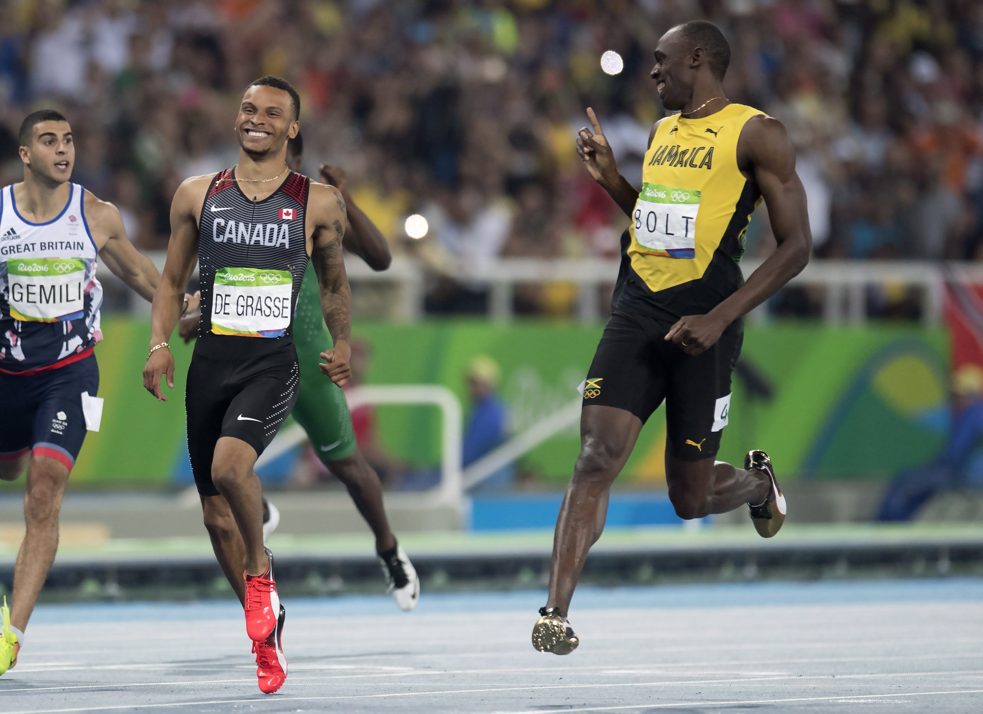 Canada’s Andre De Grasse, left, and Jamaica’s Usain Bolt during a men’s 200-meter semifinal, during the athletics competitions of the 2016 Summer Olympics at the Olympic stadium in Rio de Janeiro, Brazil, Wednesday, Aug. 17, 2016. (AP Photo/Matt Dunham)