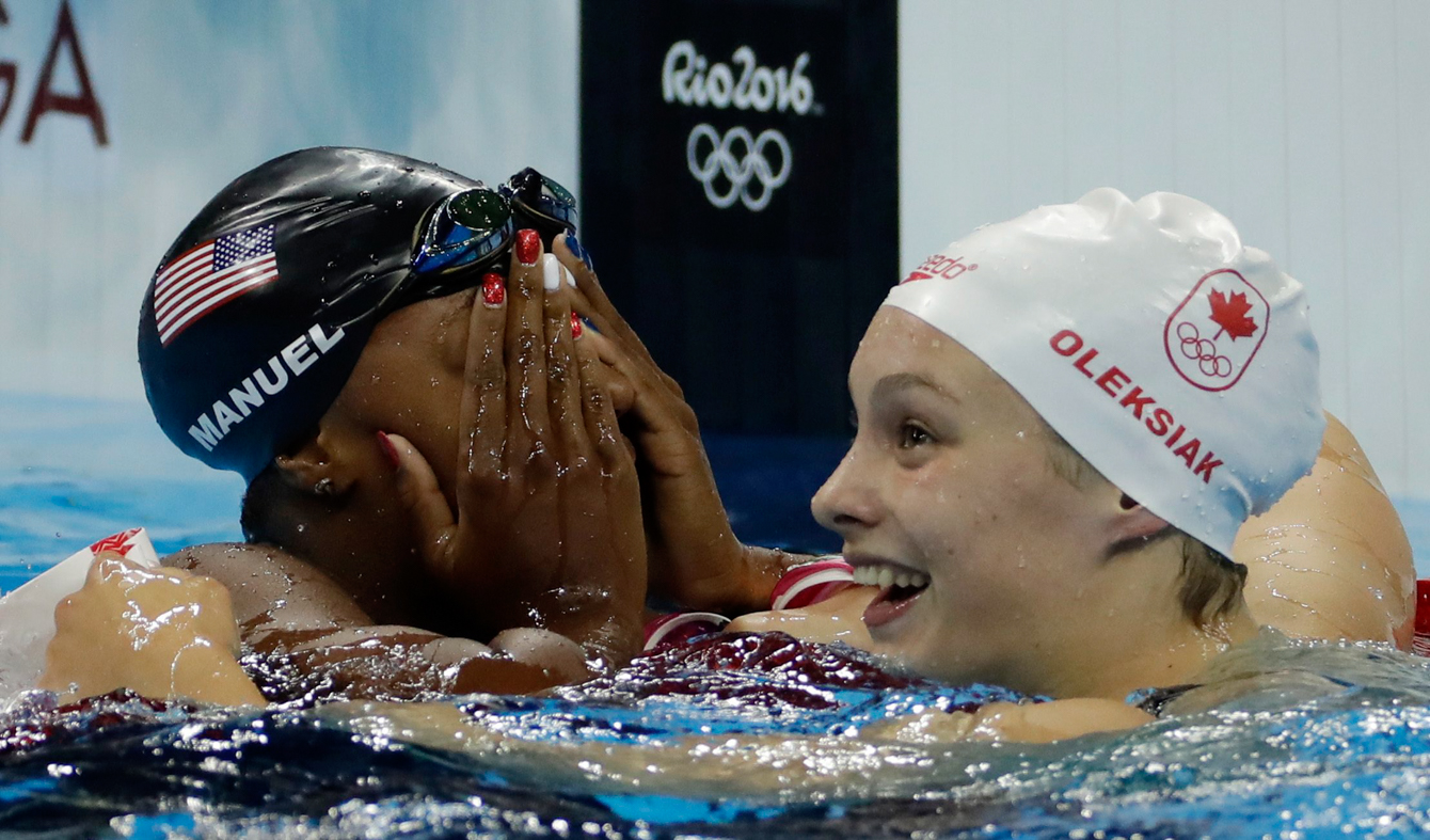 Gold medal winners United States’ Simone Manuel and Canada’s Penny Oleksiak and Sweden’s bronze medal winner Sarah Sjostrom, from left, pose for a photograph during the medal ceremony for the women’s 100-meter freestyle final during the swimming competitions at the 2016 Summer Olympics, Friday, Aug. 12, 2016, in Rio de Janeiro, Brazil. (AP Photo/Michael Sohn)