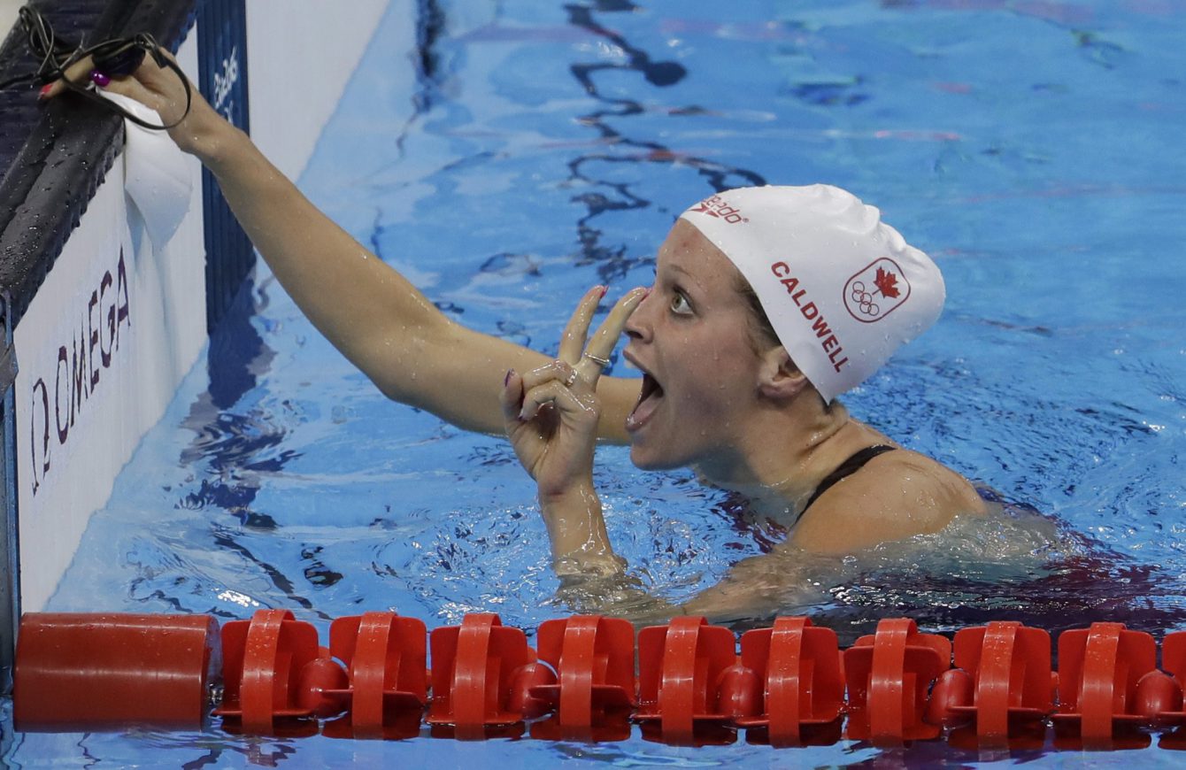 Canada’s Hilary Caldwell celebrates winning a semifinal of the women’s 200-meter backstroke during the swimming competitions at the 2016 Summer Olympics, Thursday, Aug. 11, 2016, in Rio de Janeiro, Brazil. (AP Photo/Natacha Pisarenko)