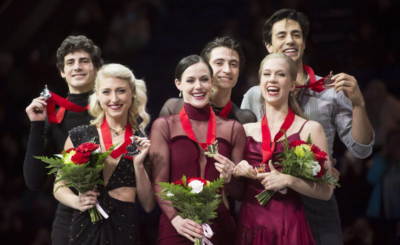 Ice dance gold medallists Tessa Virtue and Scott Moir, centre, silver medallists, Piper Gilles and Paul Poirier, left, and bronze medallists Kaitlyn Weaver and Andrew Poje, right, hold their medals following the 2018 Canadian National Skating Championships in Vancouver, B.C., Saturday, Jan. 13, 2018. THE CANADIAN PRESS/Jonathan Hayward